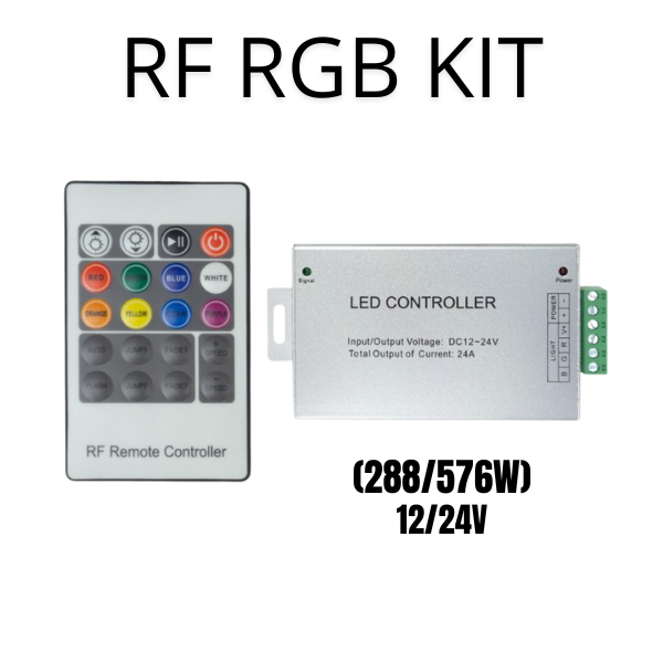 Kontroler KIT za RGB LED trake s maksimalnim opeterećenjem od 288W za 12V trake te 576W za 24V trake, zajedno s RF daljinskim upravljačem na 2.4 GHz.