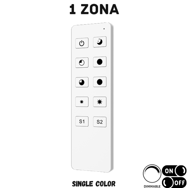 Daljinski 1-zone upravljač za RF Dimmere koji rade na 2.4GHz za kontrolu dimmera do 30 m udaljenosti. Dolazi u kompletu s zidnim nosačem.